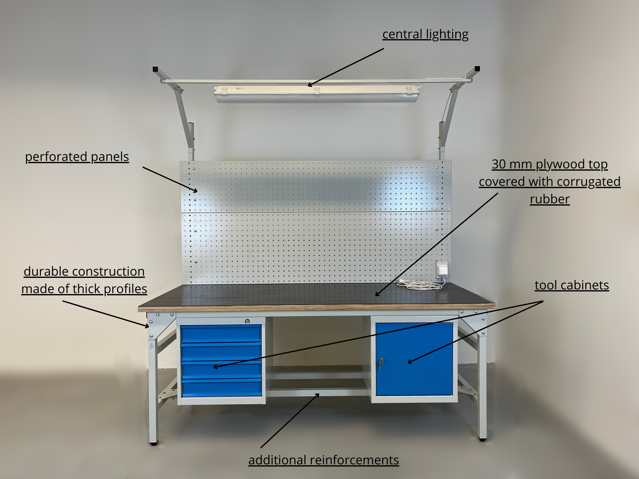 Additional equipment: very often, high-quality workshop tables are distinguished from cheaper substitutes by their modular nature and the wide range of accessories that can be installed. Among the extras typical of such workbenches, we distinguish under-counter tool cabinets with drawers, perforated panels with holders for tools (wrenches, screwdrivers, drills, etc.) and storage containers (e.g., for storing screws, nuts, bolts), central lighting, additional shelves to facilitate the organization of the workstation, or power strips for connecting electrical tools.