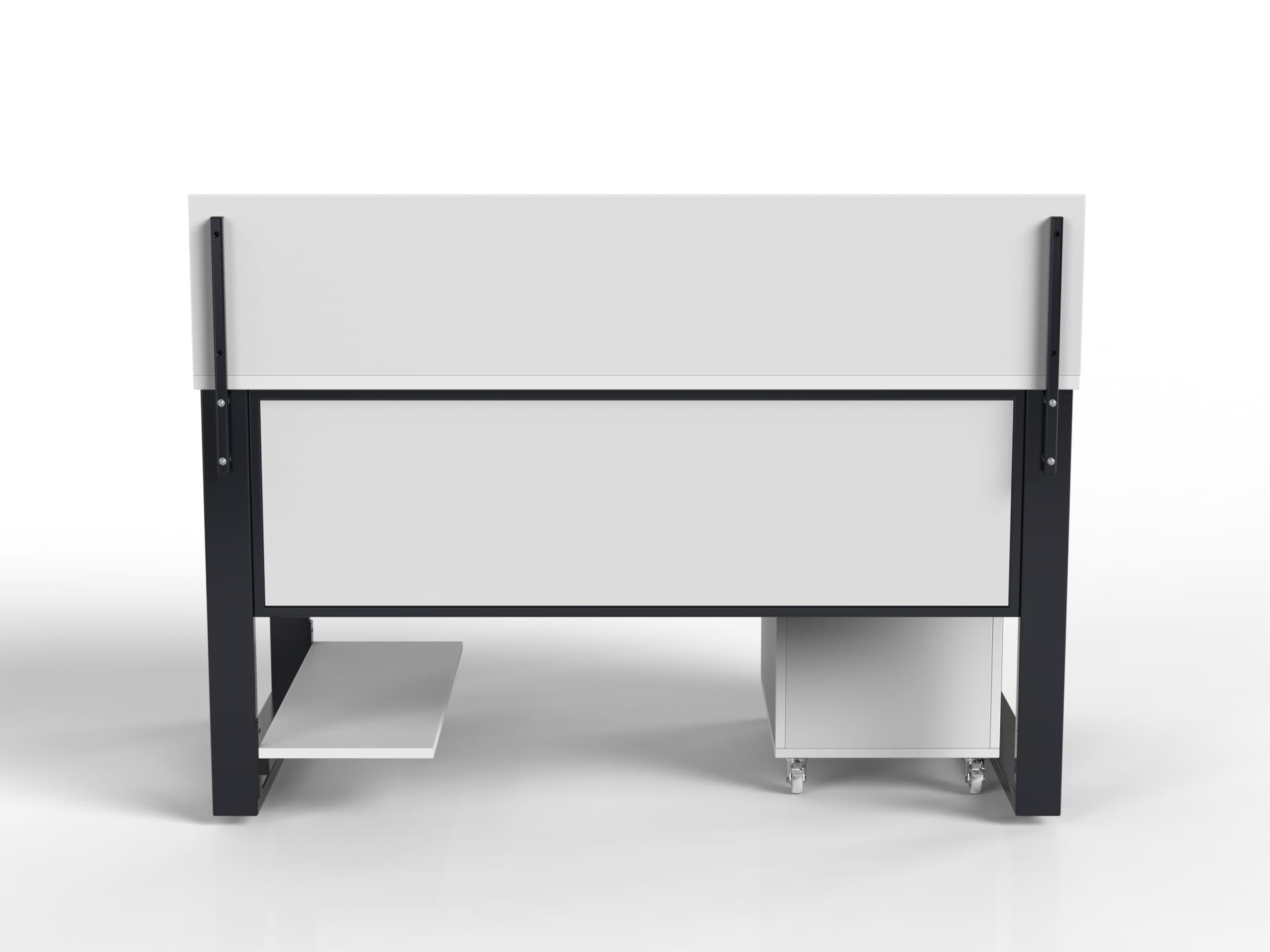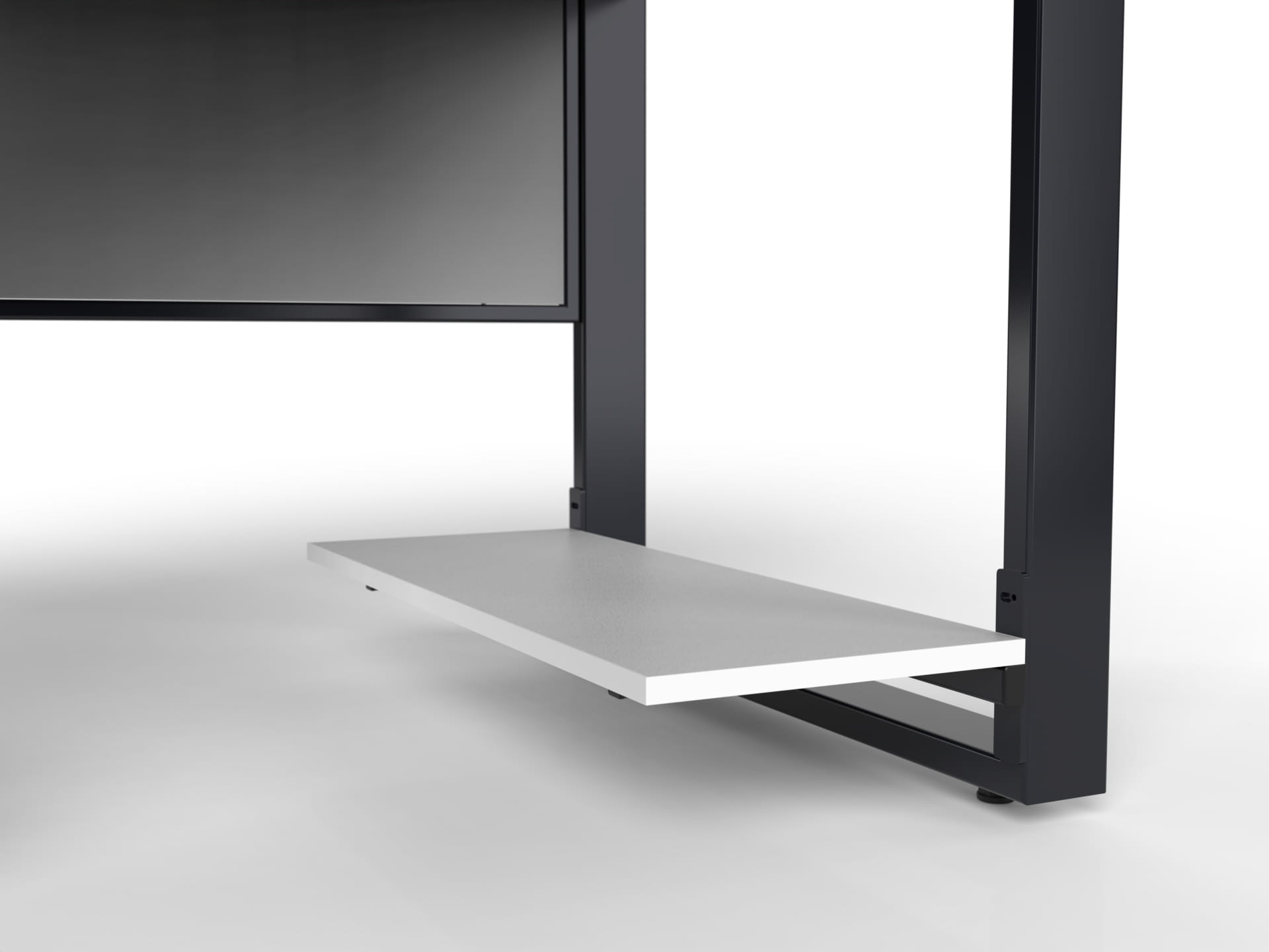 PC shelf mounted on the inside or outside of the loft desk legs
