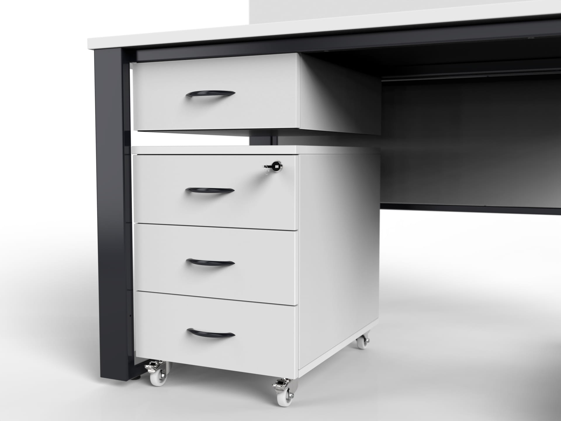 cabinet on wheels with three drawers lockable by central locking system
