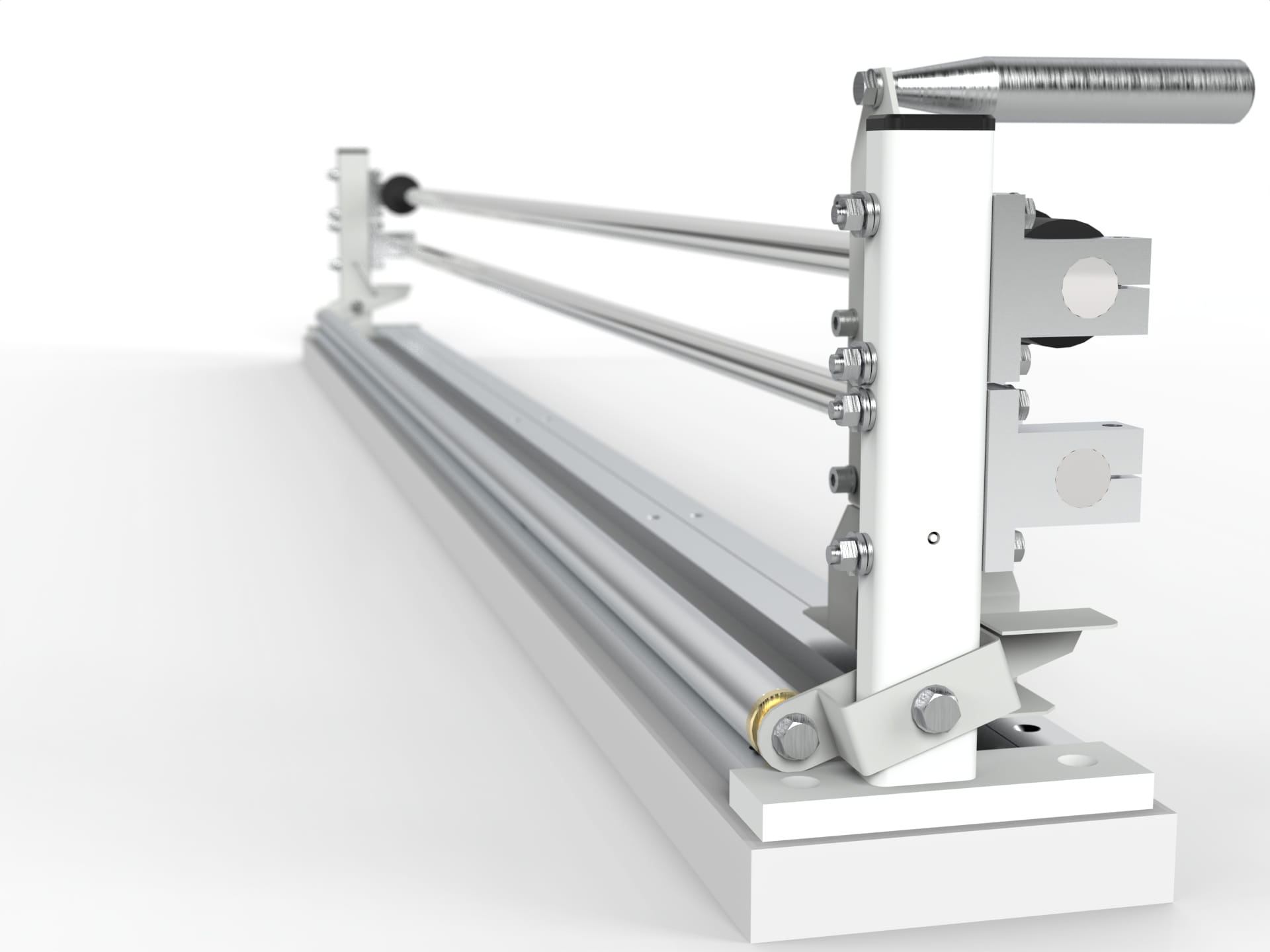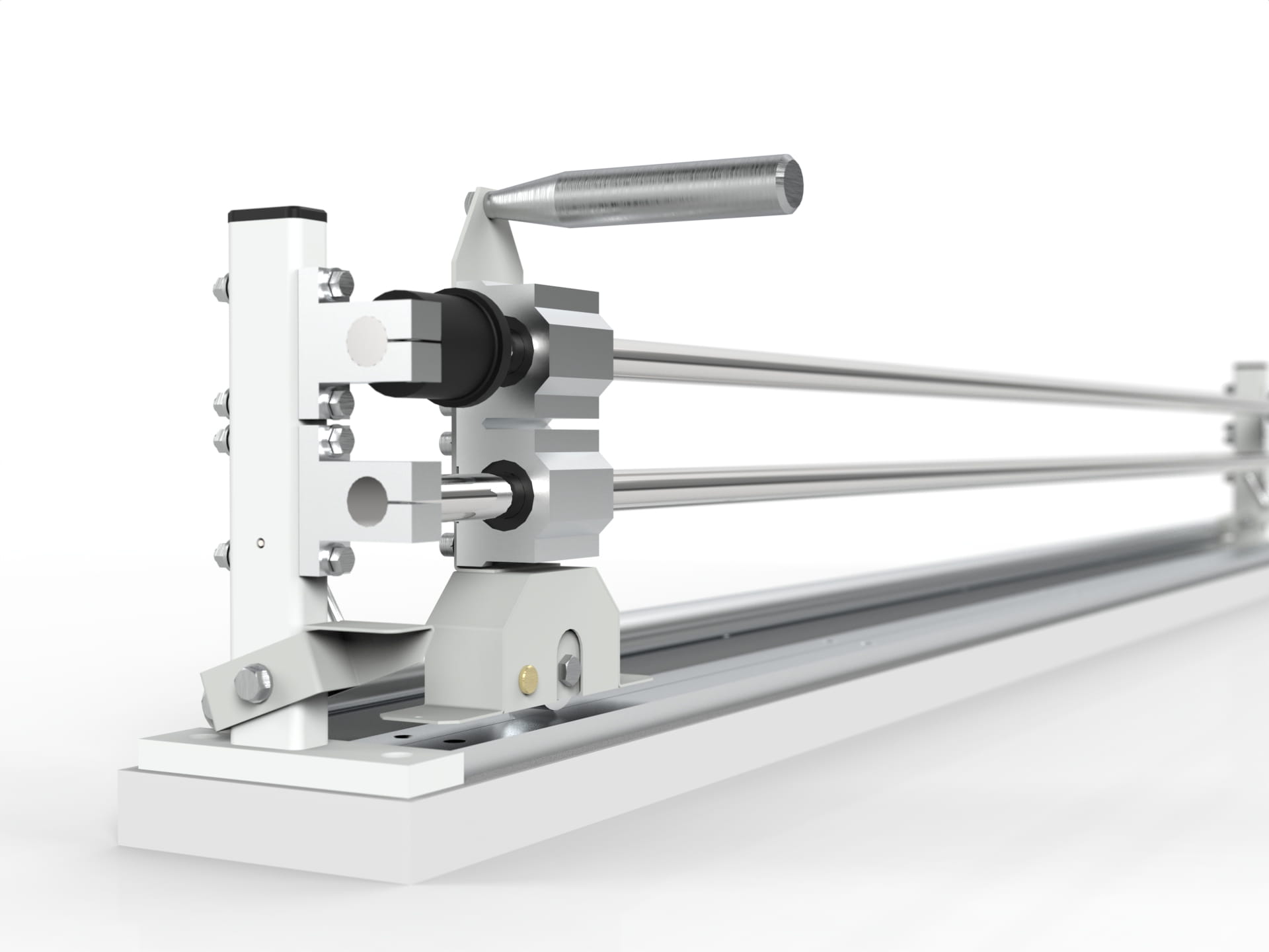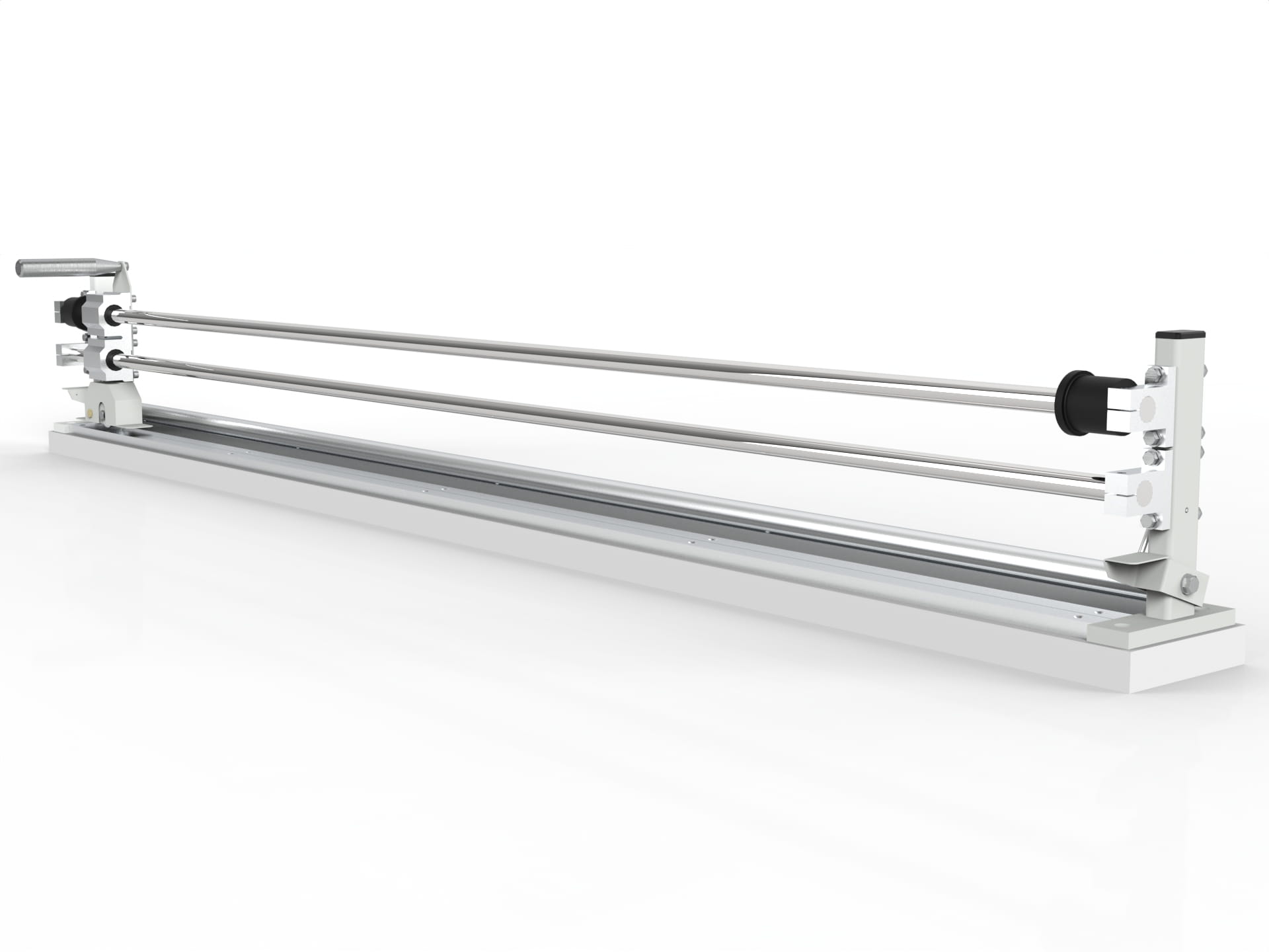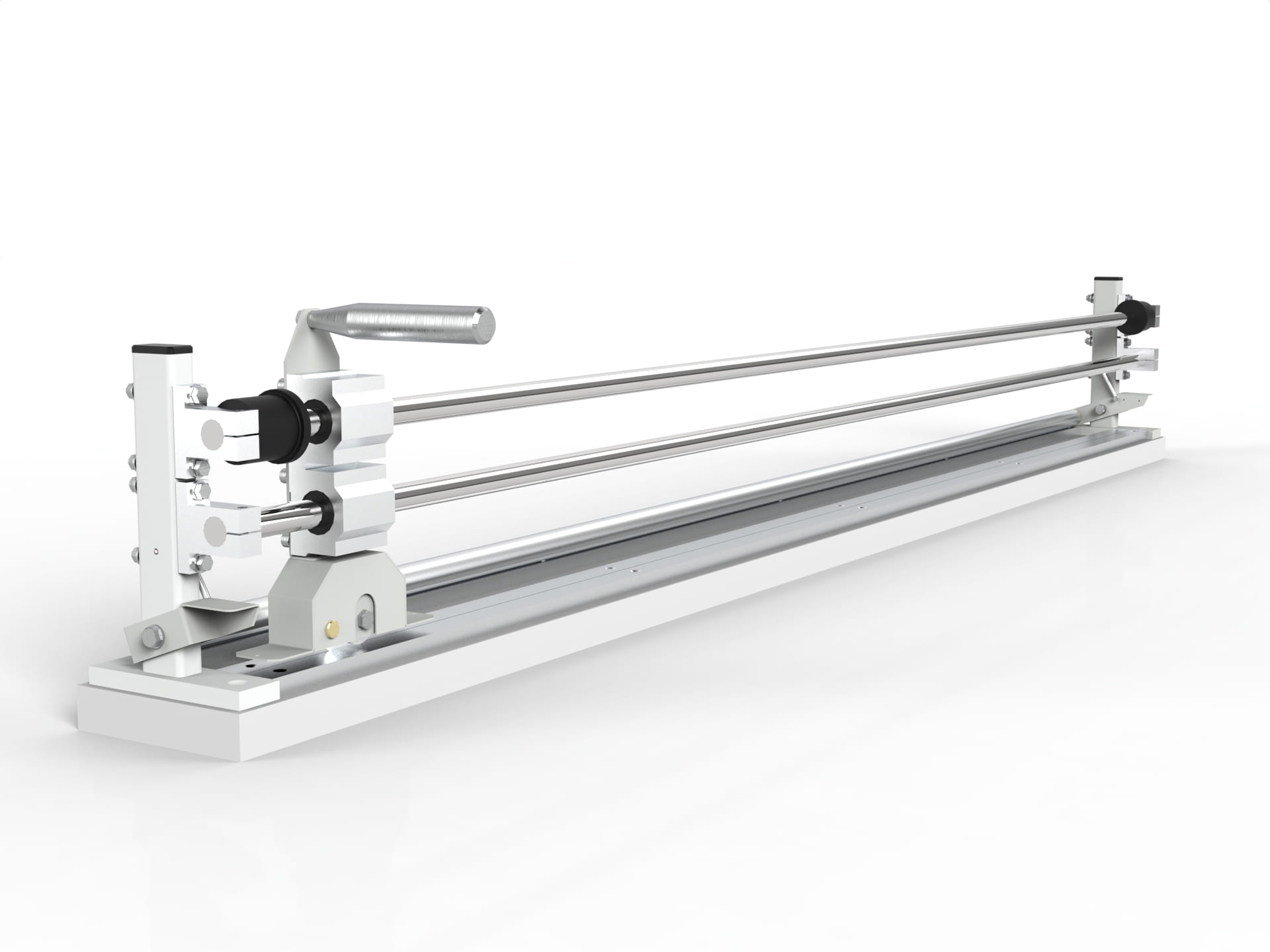 Manual cutter. Different working lengths of the cutter available . The cutter is equipped with an Olafa round knife on a linear guide. After cutting, the paper unwound from the roll is held in the device by a roller clamp. Cutting is done in two directions.
