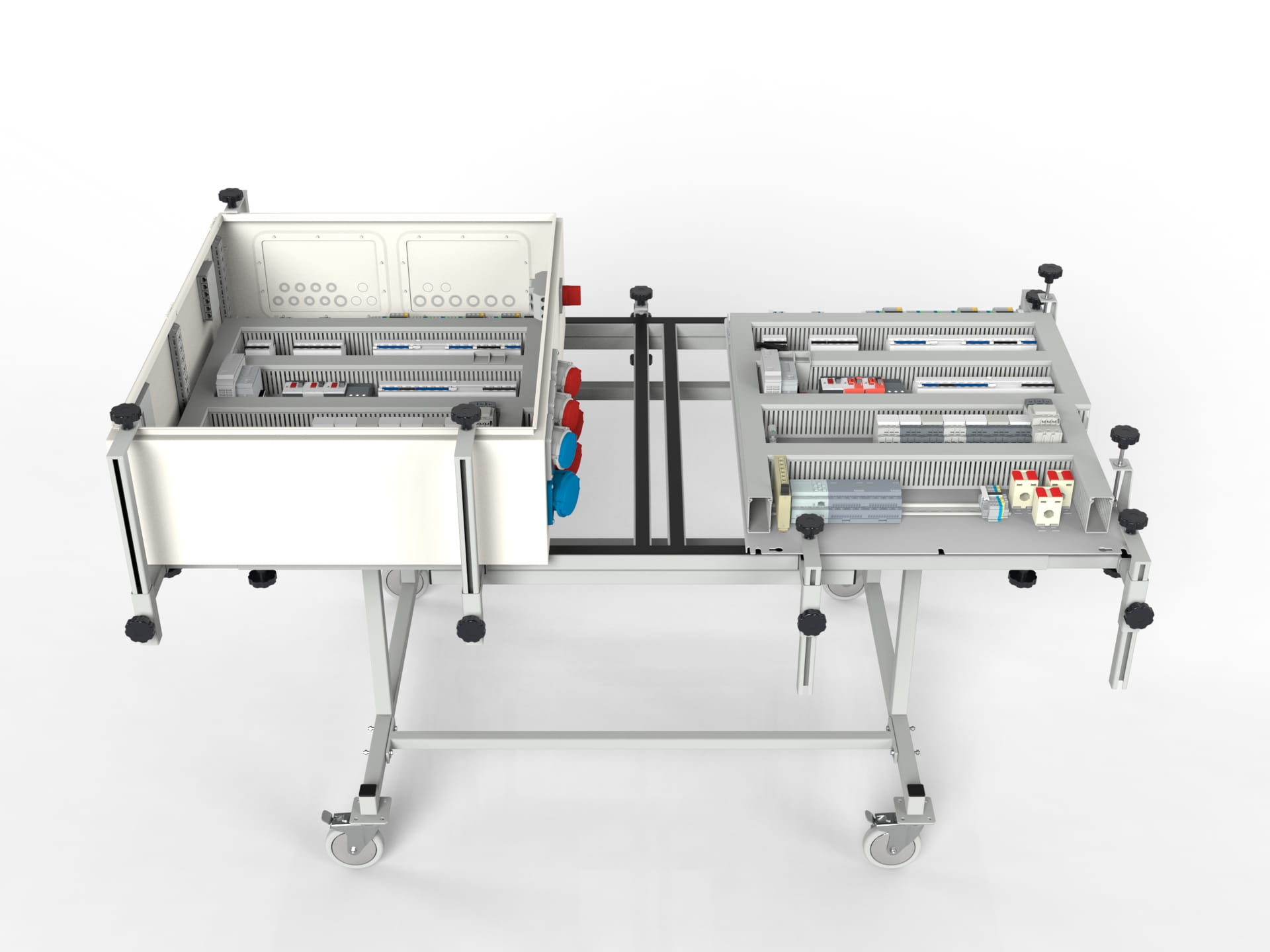 A specialised assembly station designed for the efficient mounting of control cabinet panels, electrical cabinets and for the production of wire harnesses. The station features flexible manual configuration of the work surface thanks to a system for adjusting the height of the frame and the tilt angle of the work area. It is also distinguished by the possibility of adjusting the size of the operating frame to the size of the mounted enclosure, making it possible to assemble various panels from all cabinet manufacturers. The high level of ergonomics improves worker's comfort and guarantees easy access to all sections of the mounted assembly board or cabinet. Therefore, the use of the SMR-SPEC-03084 table by professionals significantly improves work efficiency and production processes related to prefabrication by up to several dozen percent.