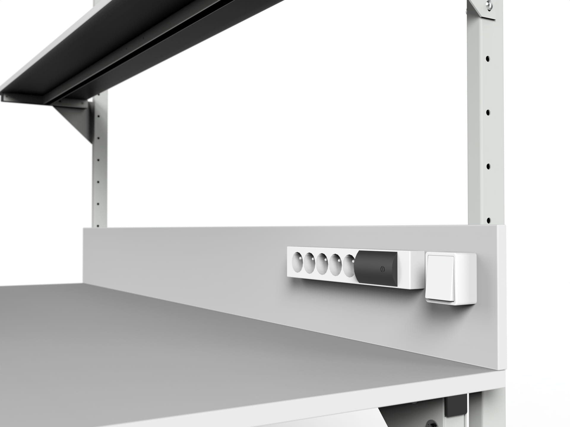 - rear wall preventing objects from falling, with attached power strip with five sockets and a light switch