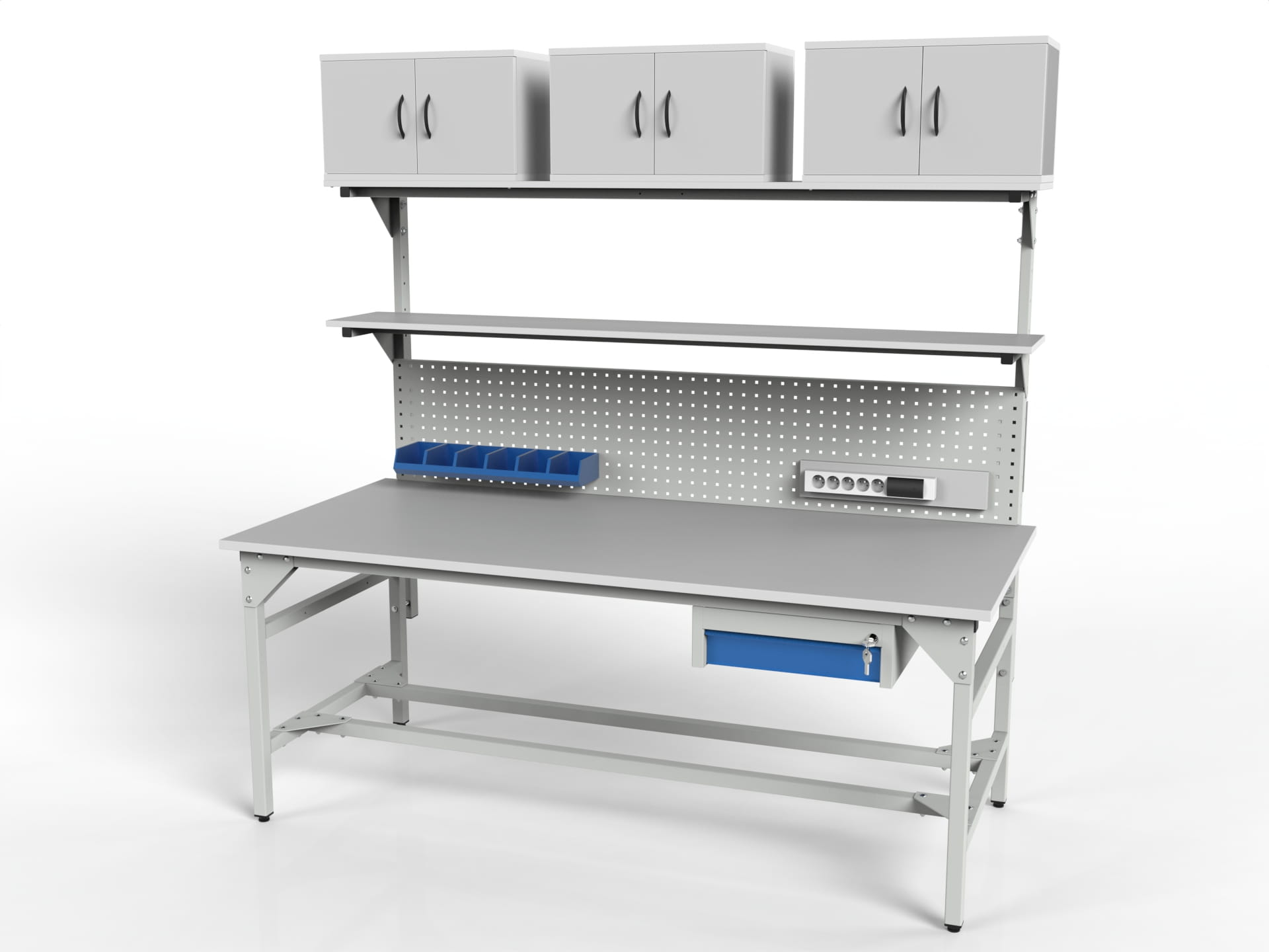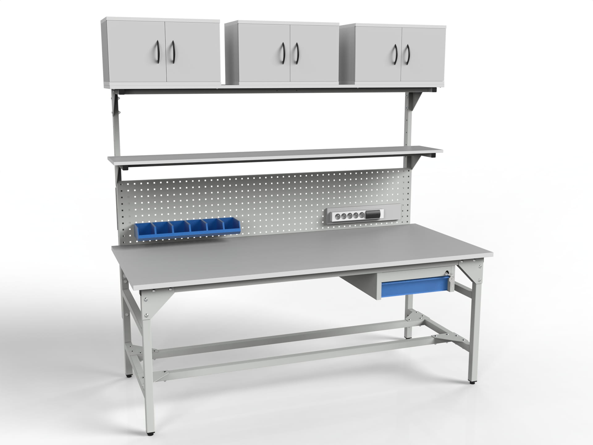 SMWPK6 workbench with shelves, cabinets, drawer, perforated wall and power strip