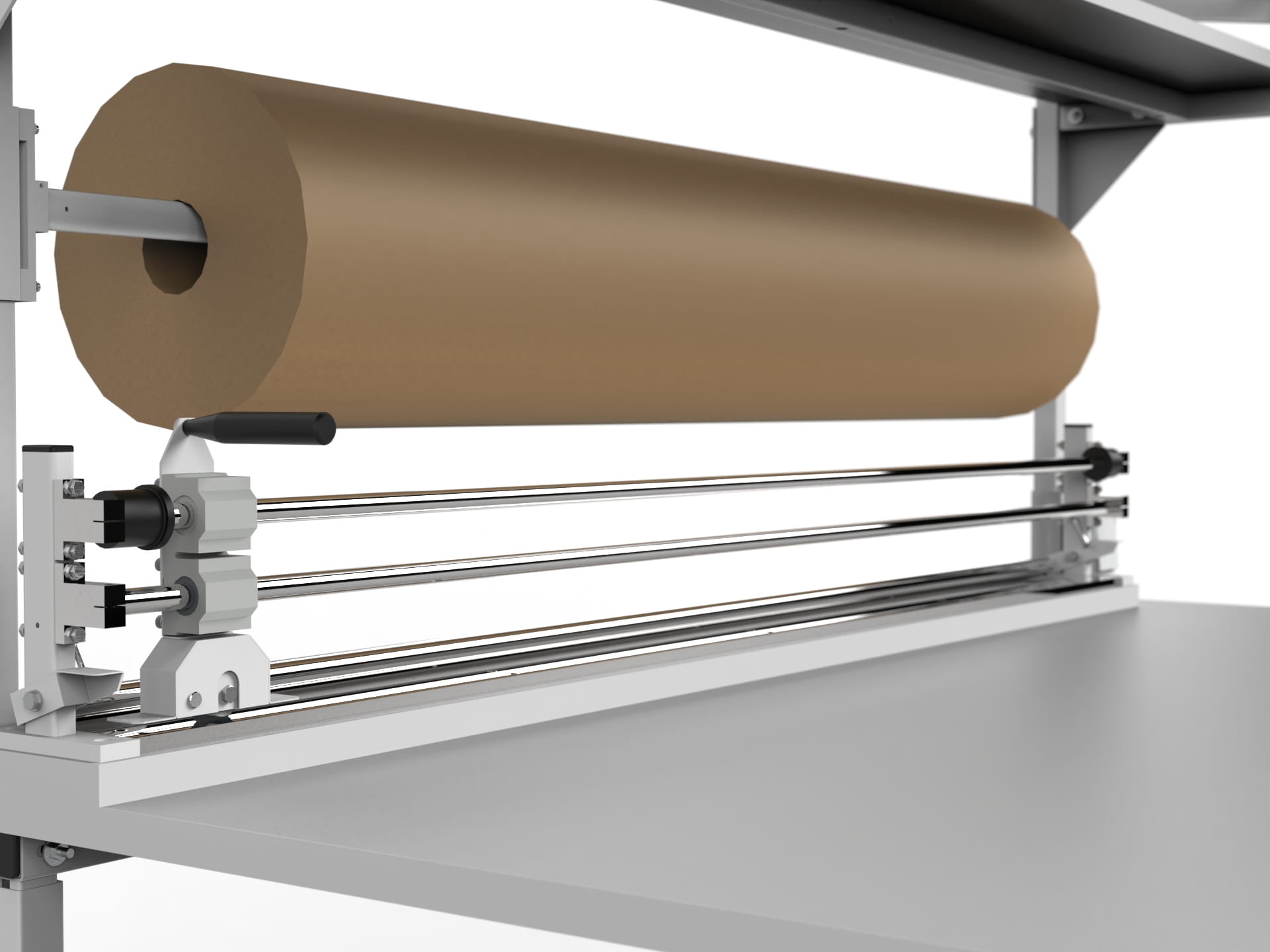 - two bearing-mounted rollers for unwinding materials (e.g. paper, bubble wrap) - one below the tabletop and one above it