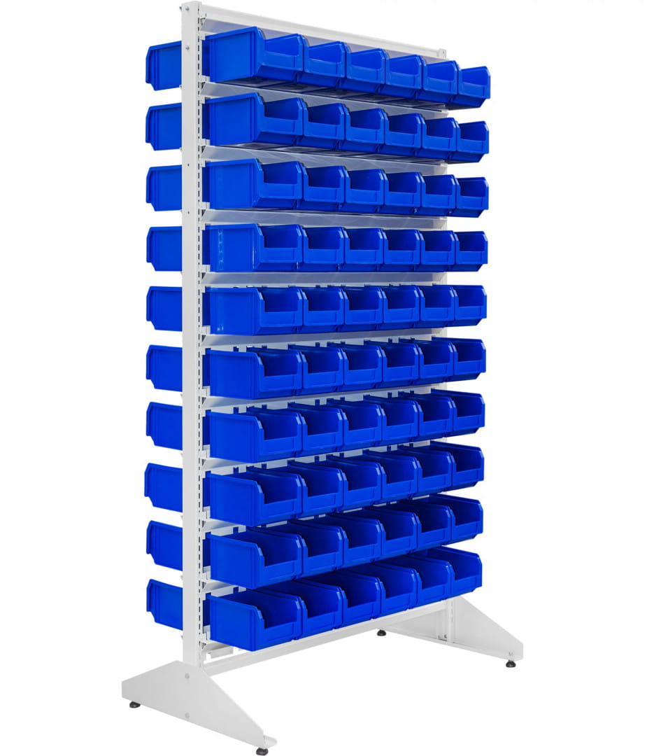 The double-sided storage bin rack is perfect for situations when you want to better organize your work space. Large number of trays in different sizes allows you to arrange both smaller (screws, washers, nuts) and larger (assembly parts, screwdrivers or other tools) assortments in an easy-to-understand and clear way. With it, you will increase efficiency both in large warehouses or production halls, as well as in stores, offices or home workshops.