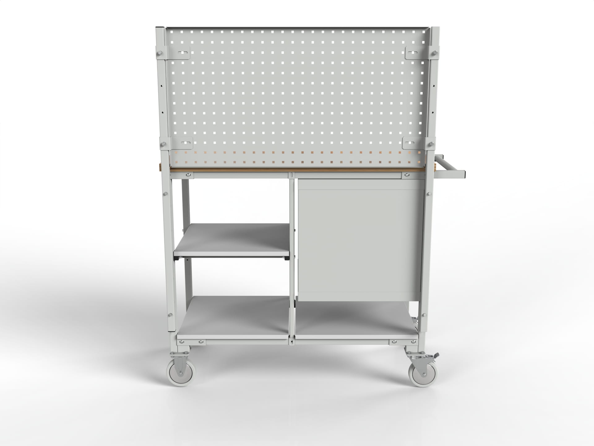 A versatile design which is a development version of Jabama's WN series of trolleys. The top is an aesthetically pleasing and durable 30 mm thick hardwood plywood with a clear lacquer finish; directly above it is a perforated wall which makes it possible to fit a wide range of additional equipment - from tool holders and storage containers to power strips and monitor arms. The under-counter space has been arranged with a tool cabinet with four pull-out drawers (also available with three drawers or a shelf in the centre) - lockable with a central lock - and three shelves made of laminated board. The entire unit is based on a stable construction made of powder-coated steel profiles and four castors - two swivel with a brake and two guides; additional functionality is provided by a handle for easier steering. WN-14703 has been designed as a versatile trolley for storing and transporting large quantities of various elements - tools, assembly parts, bits, paper, etc., which is why it can be used in various industrial workshops, production plants, service workshops or even in garages.