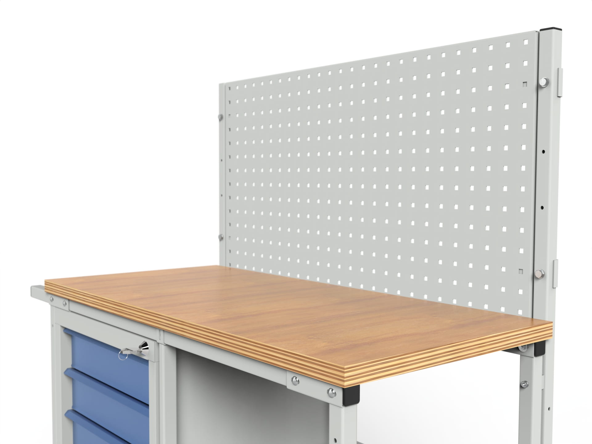- perforated panel 520 mm high (from the tabletop surface) and 987 mm wide, 9 mm square holes in a 38 mm grid, made of powder-coated steel