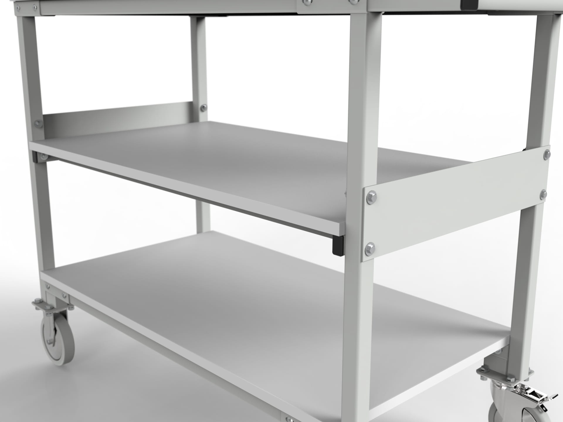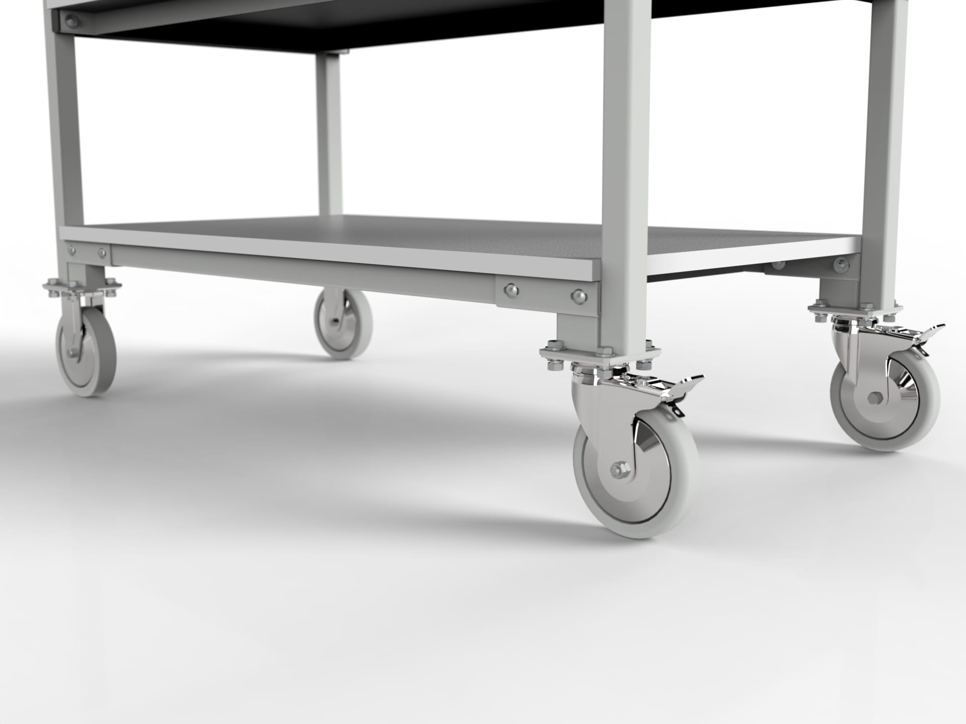 4) Wheels 125 mm with plain bearing. Two fixed guide wheels and two swivel wheels with break. On demand trolley will be equipped with four swivel wheels.