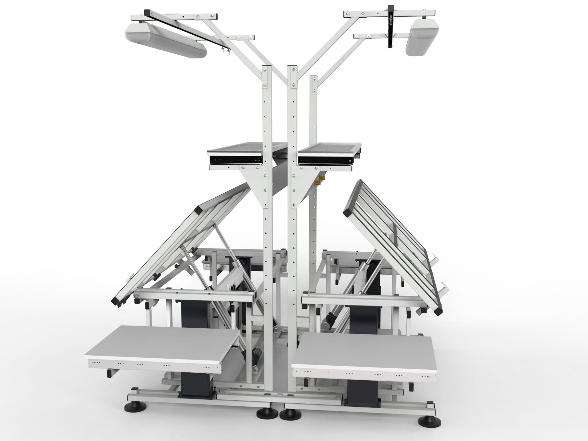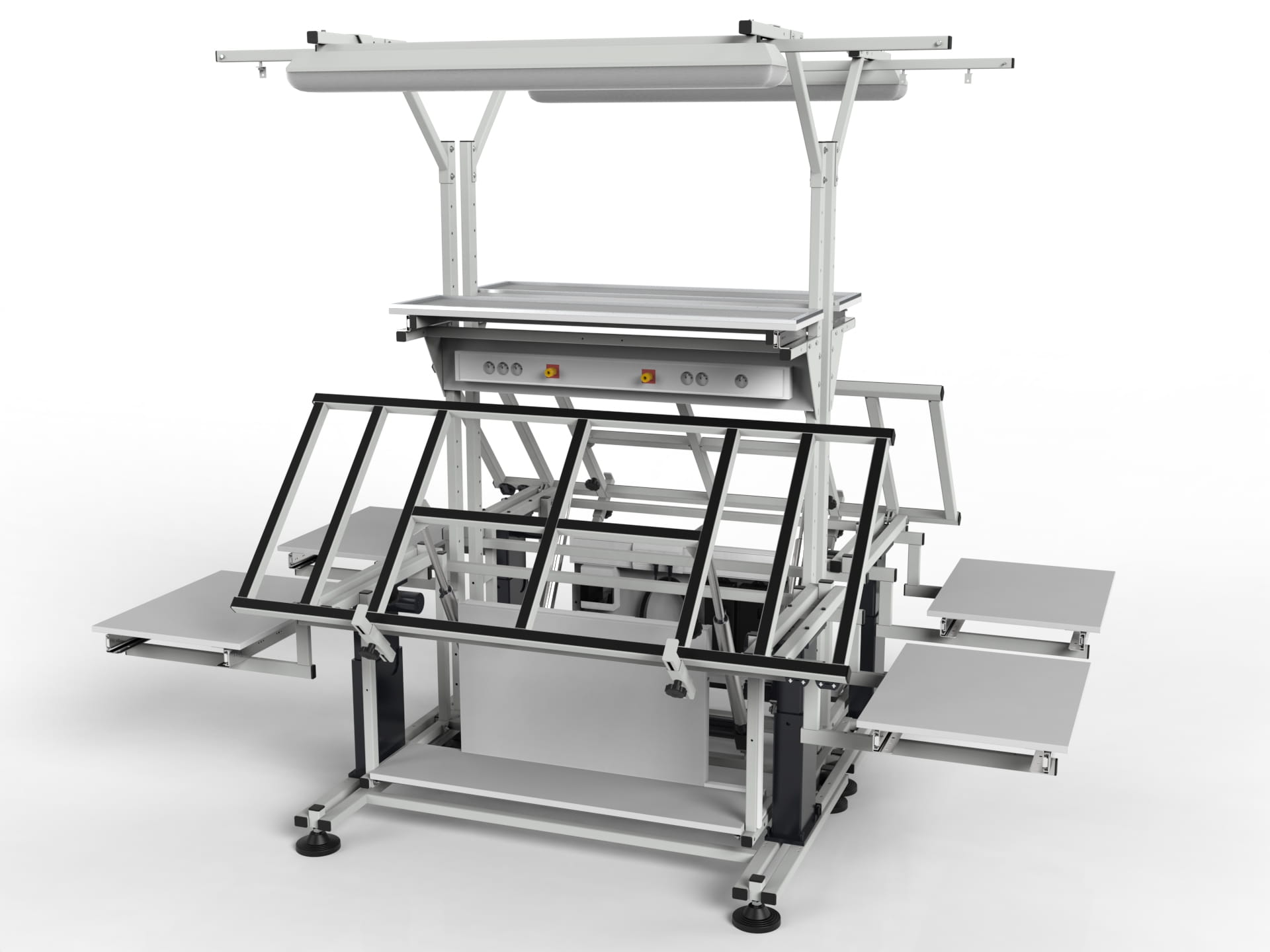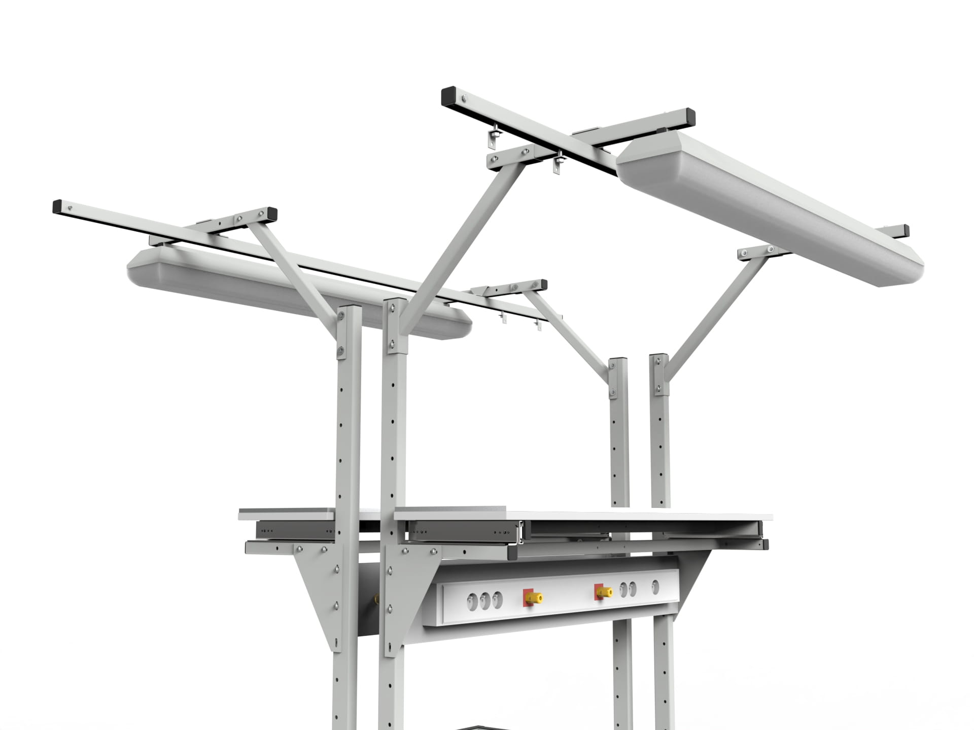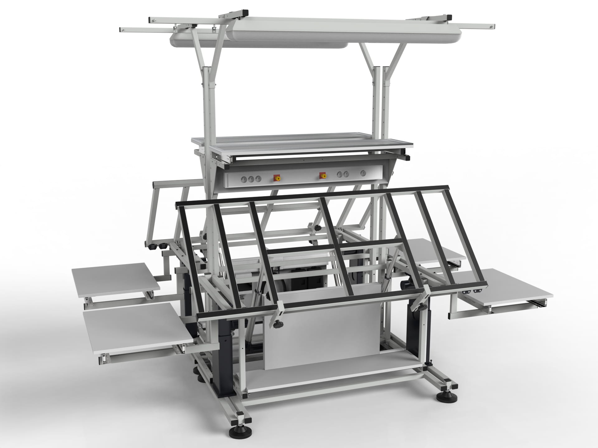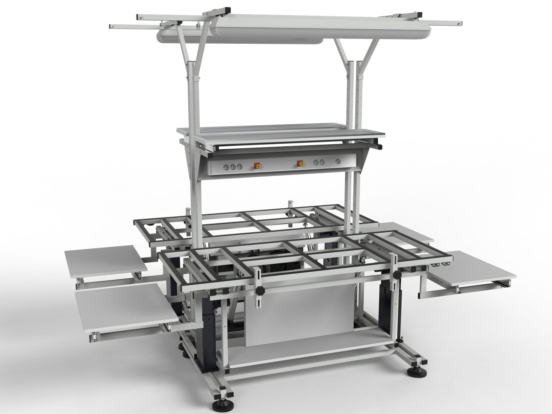 A combination of two identical tables, the ZSMRE is ideal when you want to save space and wire connections. The steel construction is robust and stable, resulting in a load capacity of up to 200 kg per table. Pull-out side and top shelves provide additional storage space for the materials and tools you need, and lighting allows you to work in any conditions. Additional functionality is provided by electric height and tilt adjustment, rubber covering of the work surface, balancer handle and power sockets. All of this makes the ZSMRE ideal for work involving the manufacture of electrical cabinets, panels and switchboards, especially in conjunction with cable trolleys.