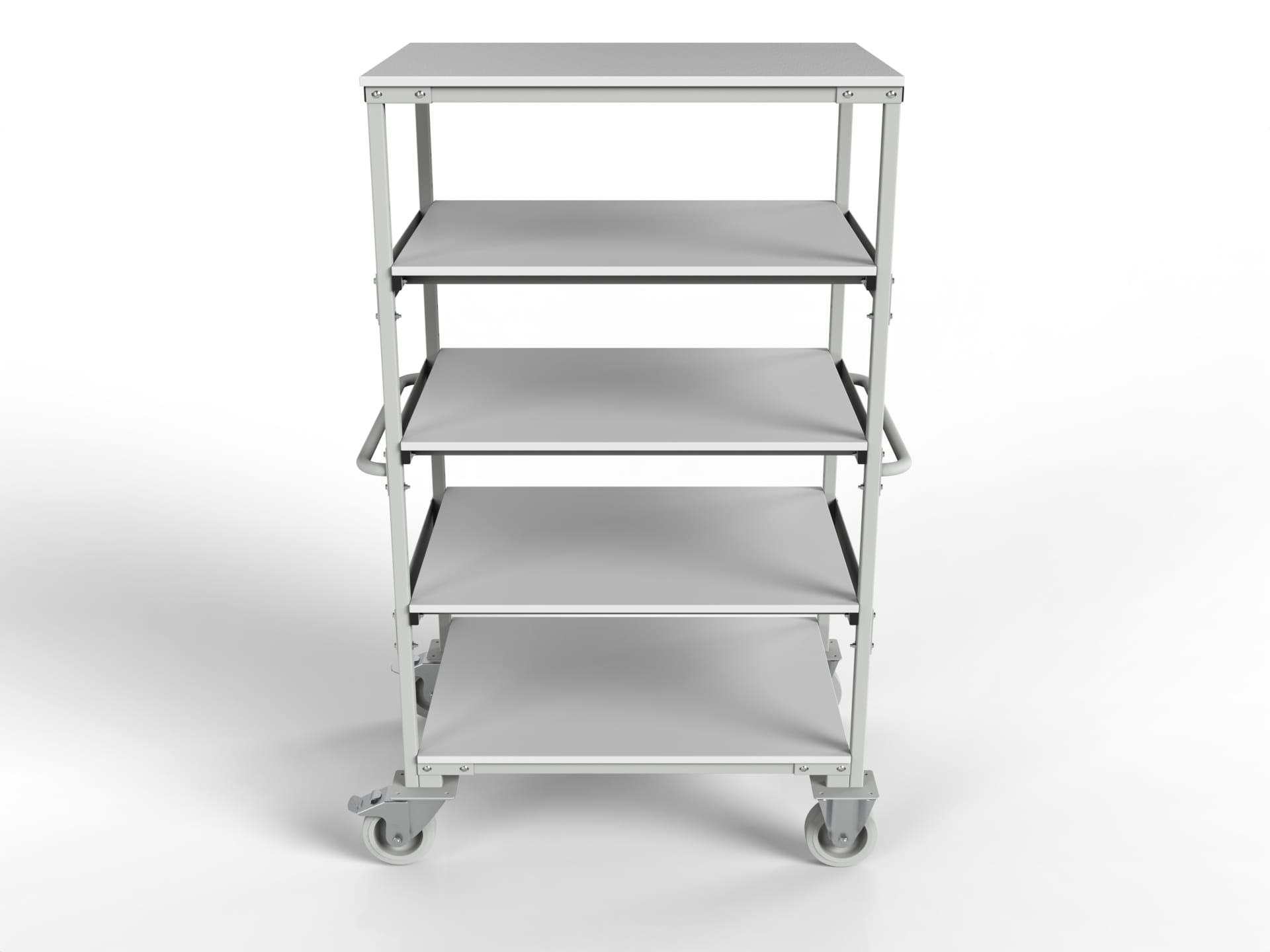The WE-05 trolley is made using technology that prevents damage caused by electrostatic charges - the metal elements of the frame are painted with conductive powder paint (light gray - RAL 7035) and the tops are cut from conductive melamine board. Four shelves measuring 925x700 mm and a larger top provide large storage space for transporting sensitive elements and components, additional functionality is also provided by the possibility of two-stage adjustment of the three middle shelves combined with the total load capacity of the trolley with even distribution at the level of 300 kg. Mobility is provided by four antistatic 125 mm wheels - two guiding and two swivel with brakes.