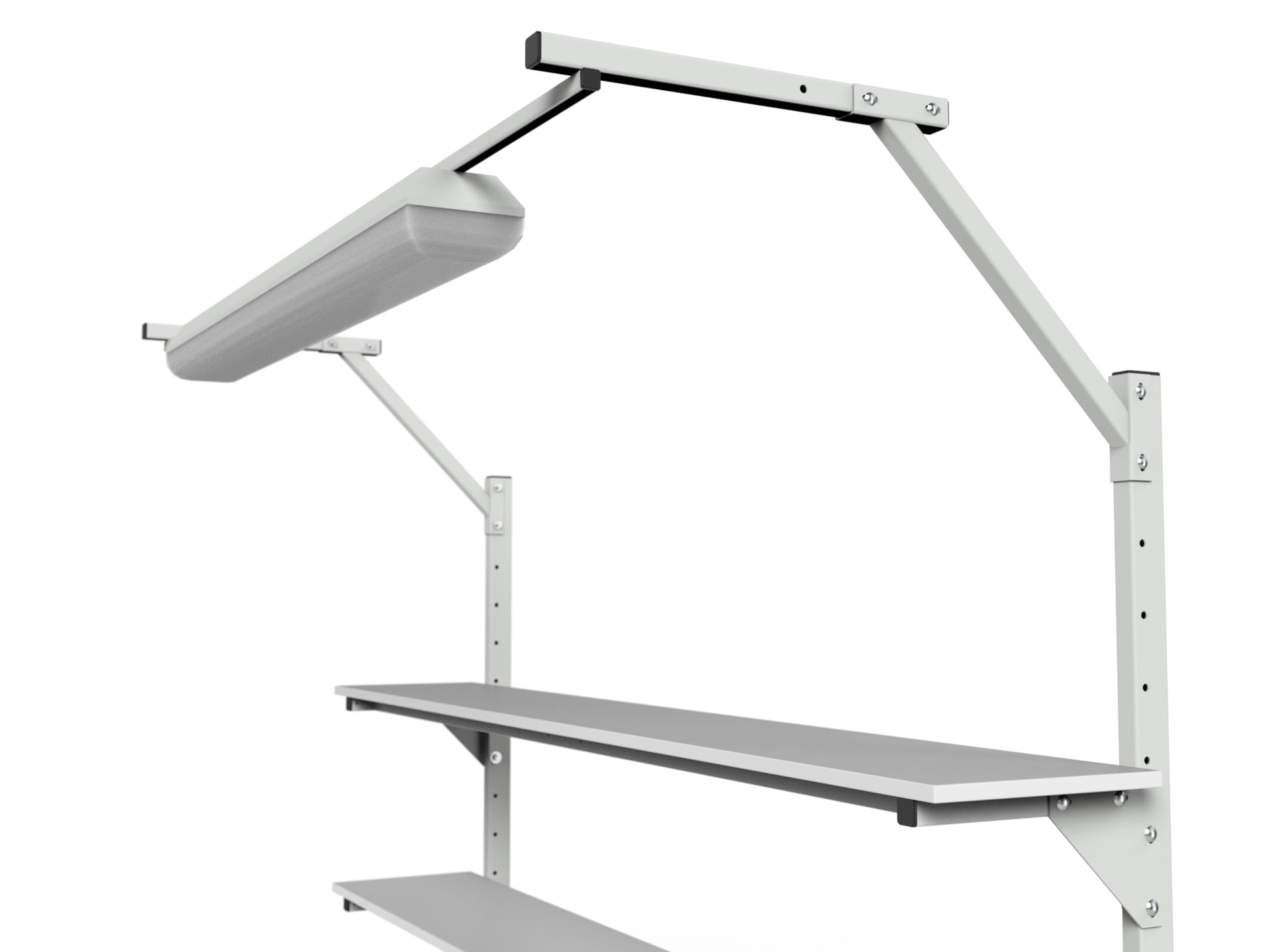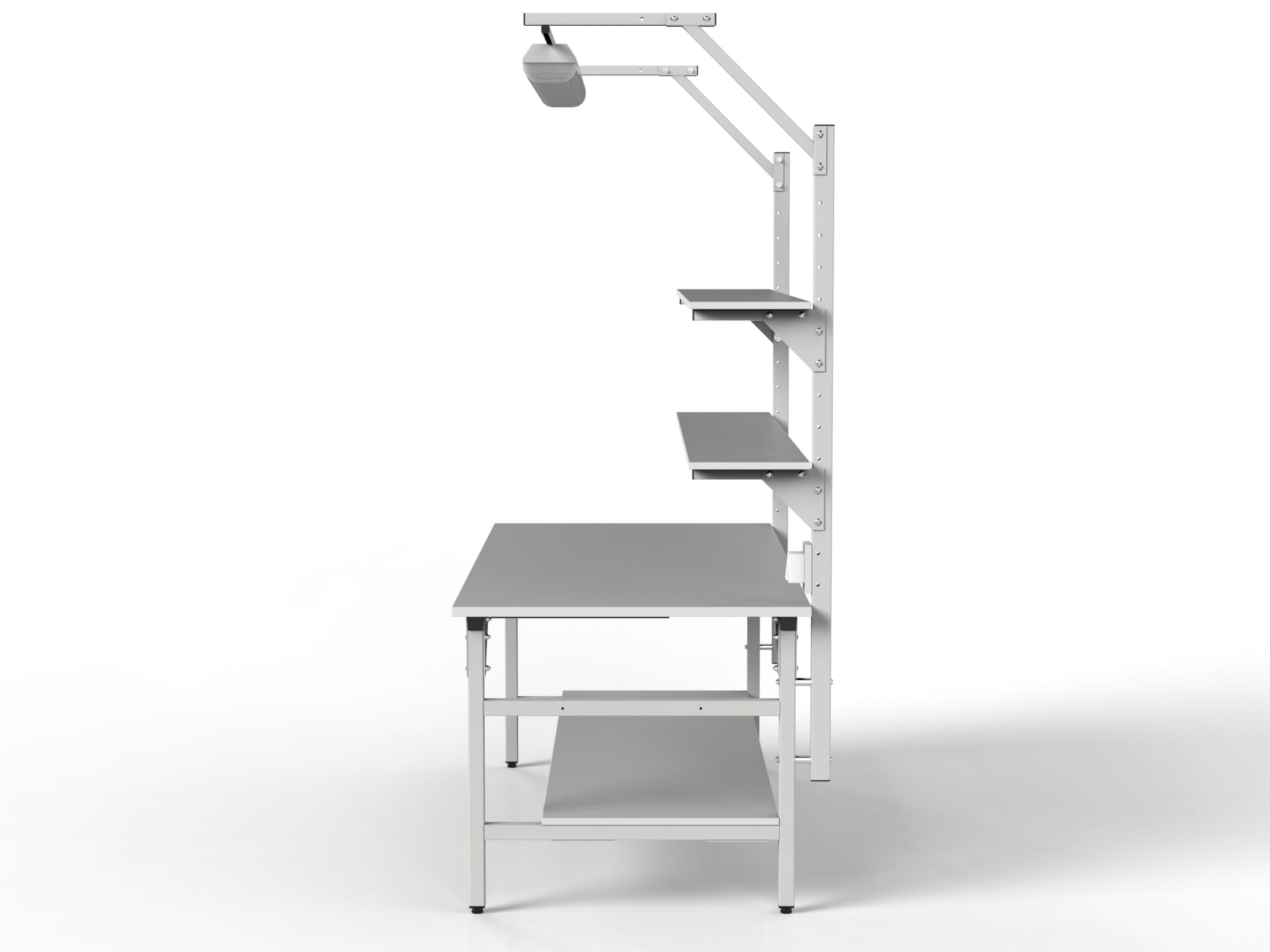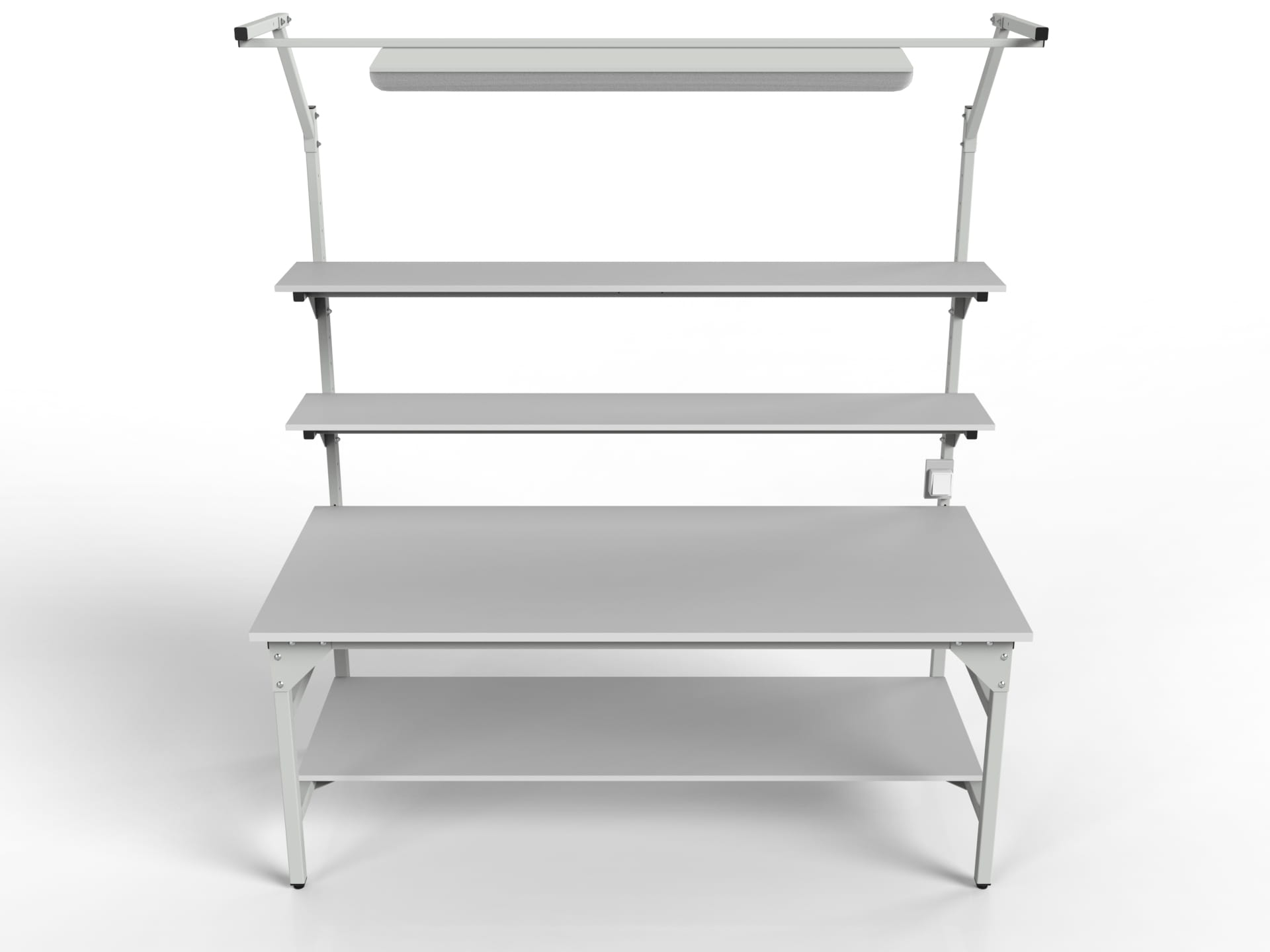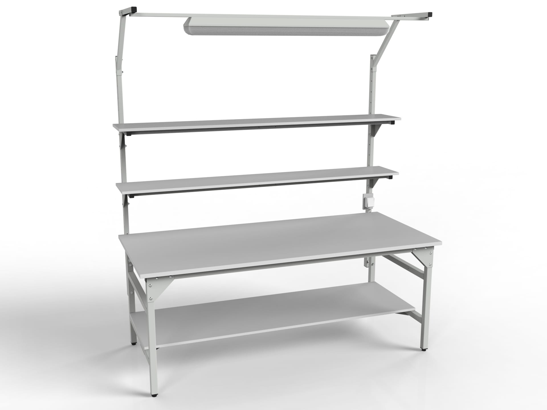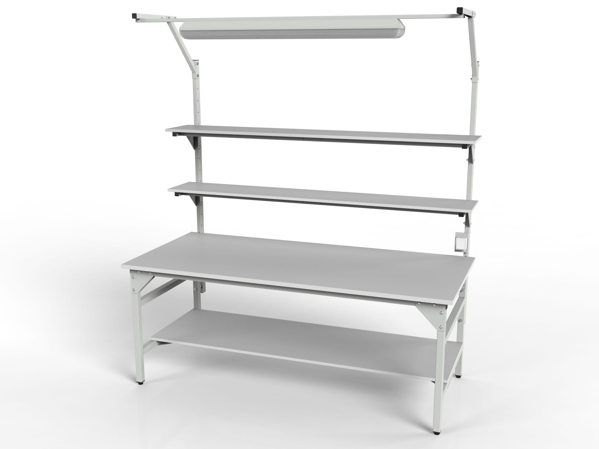 SMWPC workbench with two upper shelves, one lower shelf and central lighting